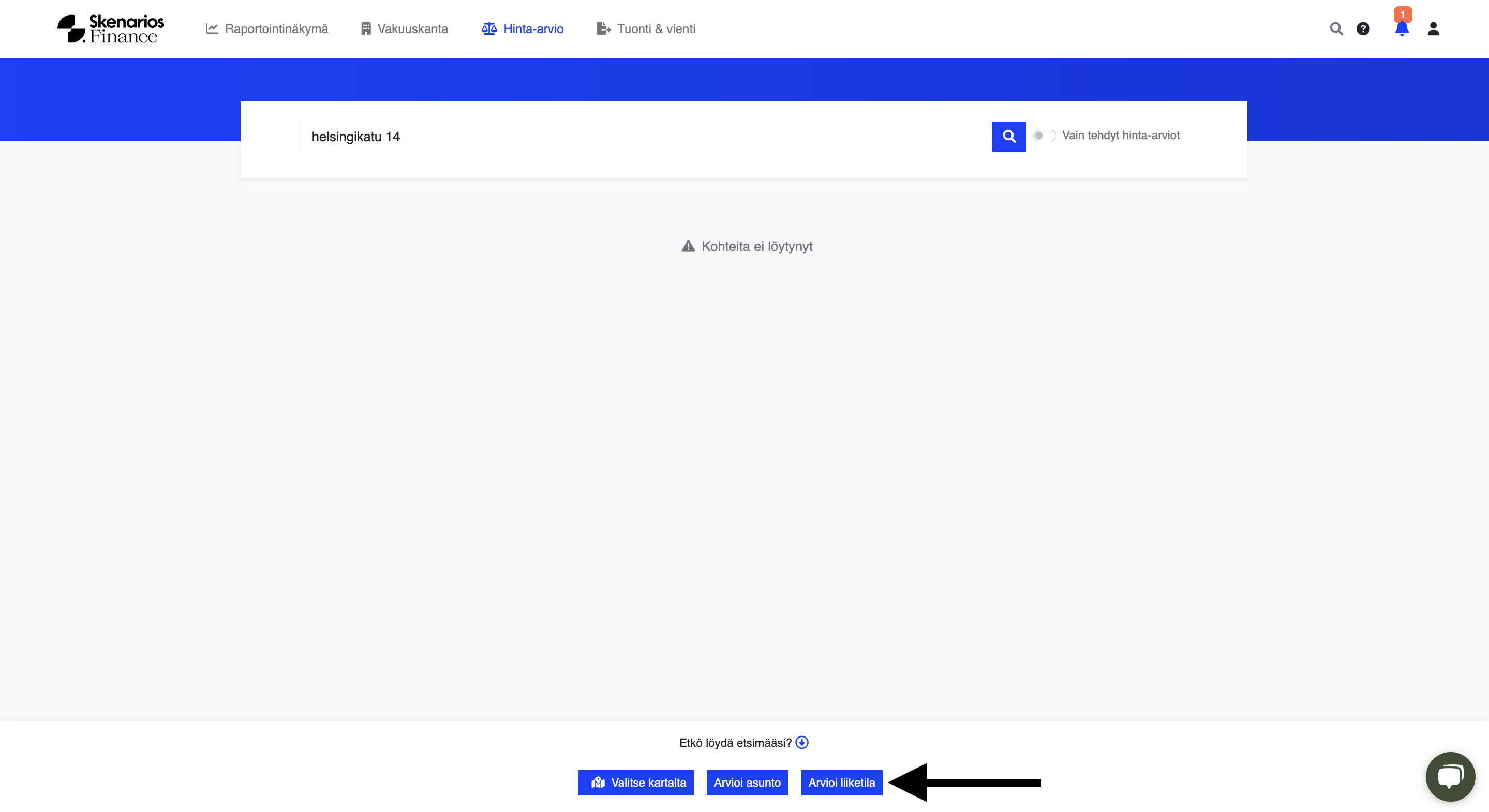 If you cannot find the object you are looking for in the list or the search result is "No objects found", you can still make a price estimate for the object by selecting the type of price estimate at the bottom of the page. The address is not always found if the object is, for example, very new, and the street does not yet exist in all map services, or the object has two possible addresses.