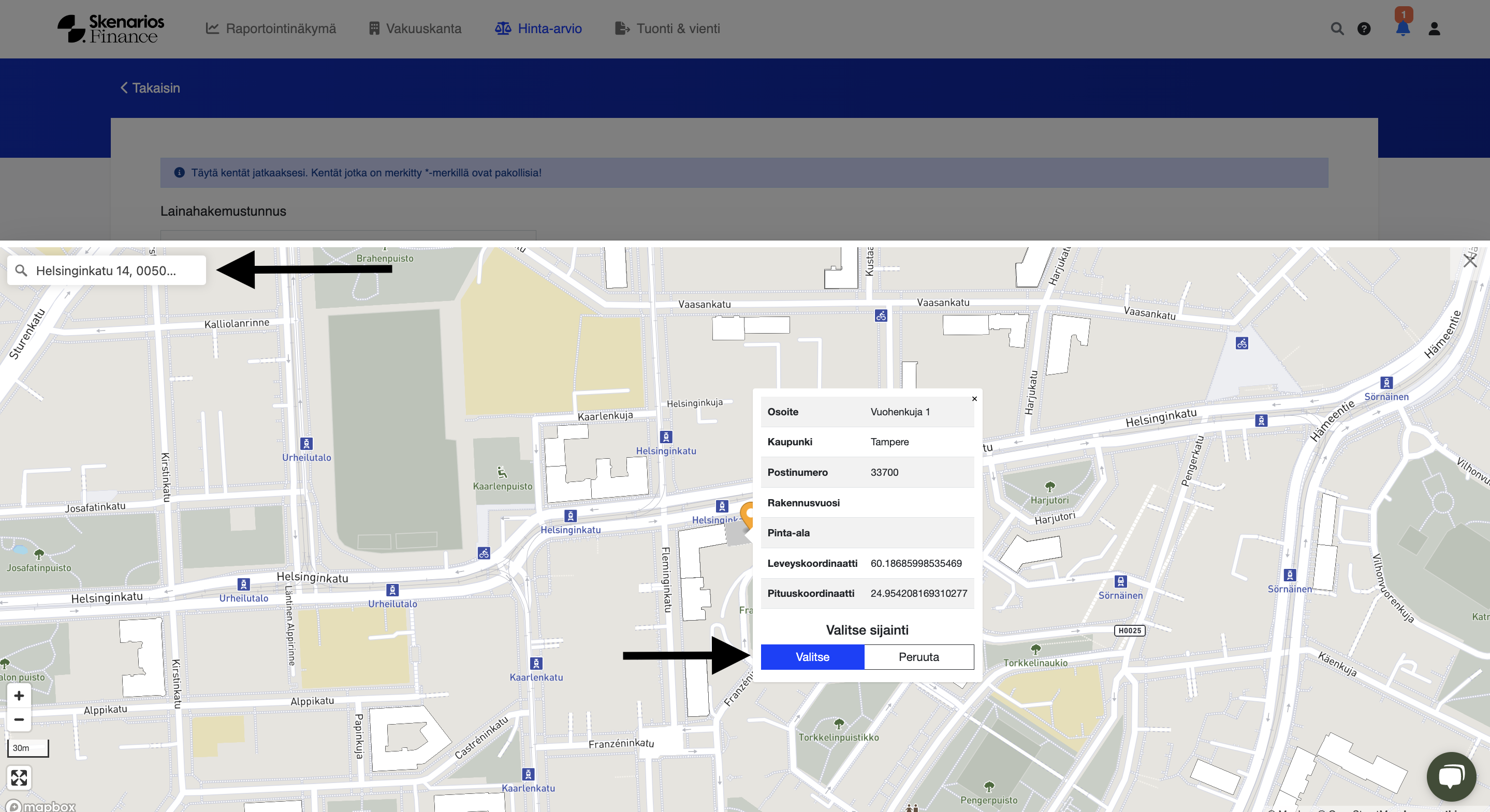 Enter the object's address on the price estimate form. Check the map that opens under the Select on the map button to see if the location of the object looks correct (compared to, for example, the location given by Google Maps or another map service). If you think the address does not match the location of the object, you can select the correct location on the map. In the upper left corner of the map, you can search for a location by address.