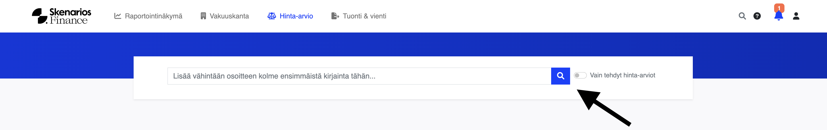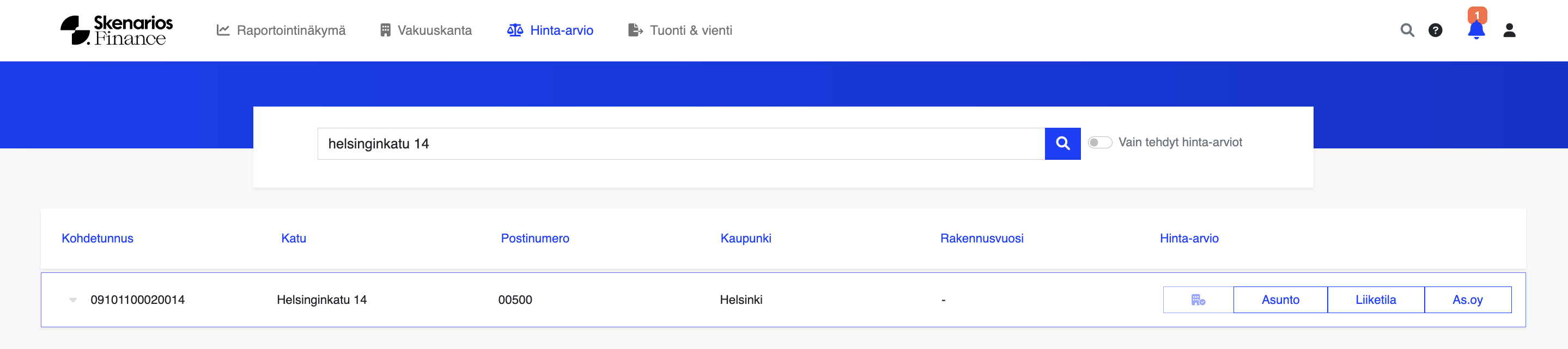 The address is given in the form: Helsinginkatu 14 or Helsinginkatu 14 Helsinki. The address field does not recognize the postal code. The more precise address of the object (apartment number) will only be entered later.
