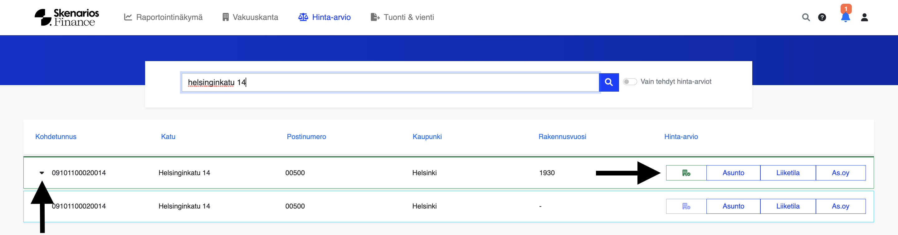 You can recognize addresses under which objects have already been evaluated in the past by the green coloring and the arrow on the left side of the address line. By clicking on the arrow, the information about the evaluated objects opens row by row. You can return to the assessment you want by pressing the Pen icon on the right side.