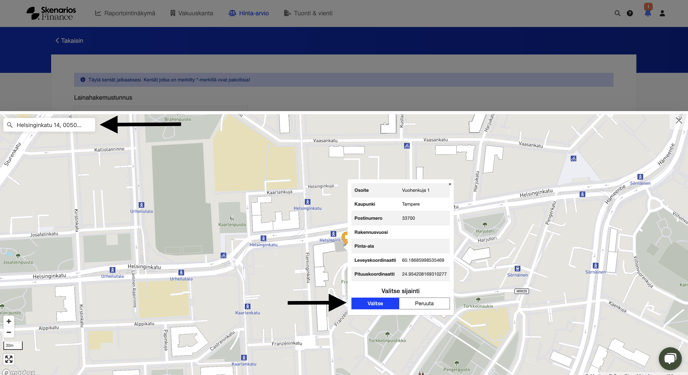 Syötä kohteen osoite hinta-arvio lomakkeelle. Tarkasta Valitse kartalta -painikkeen alta avautuvasta kartasta, että näyttääkö kohteen sijainti oikealta (verrattuna esimerkiksi Google Mapsin tai muun karttapalvelun antamaan sijaintiin). Jos osoite ei vastaa mielestäsi kohteen sijaintia voit valita kartalta oikean sijainnin. Kartan vasemmasta yläkulmasta voit hakea sijaintia osoitteella.